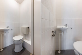Entree, videofoon, hal, 2 slaapkamers (ca. 8 m2 en ca. 11 m2) aan de voorzijde, ruime berging met wasmachine/droger aansluiting en opstelling van de CV-ketel, apart toilet met fontein, badkamer met inloopdouche en wastafelmeubel.