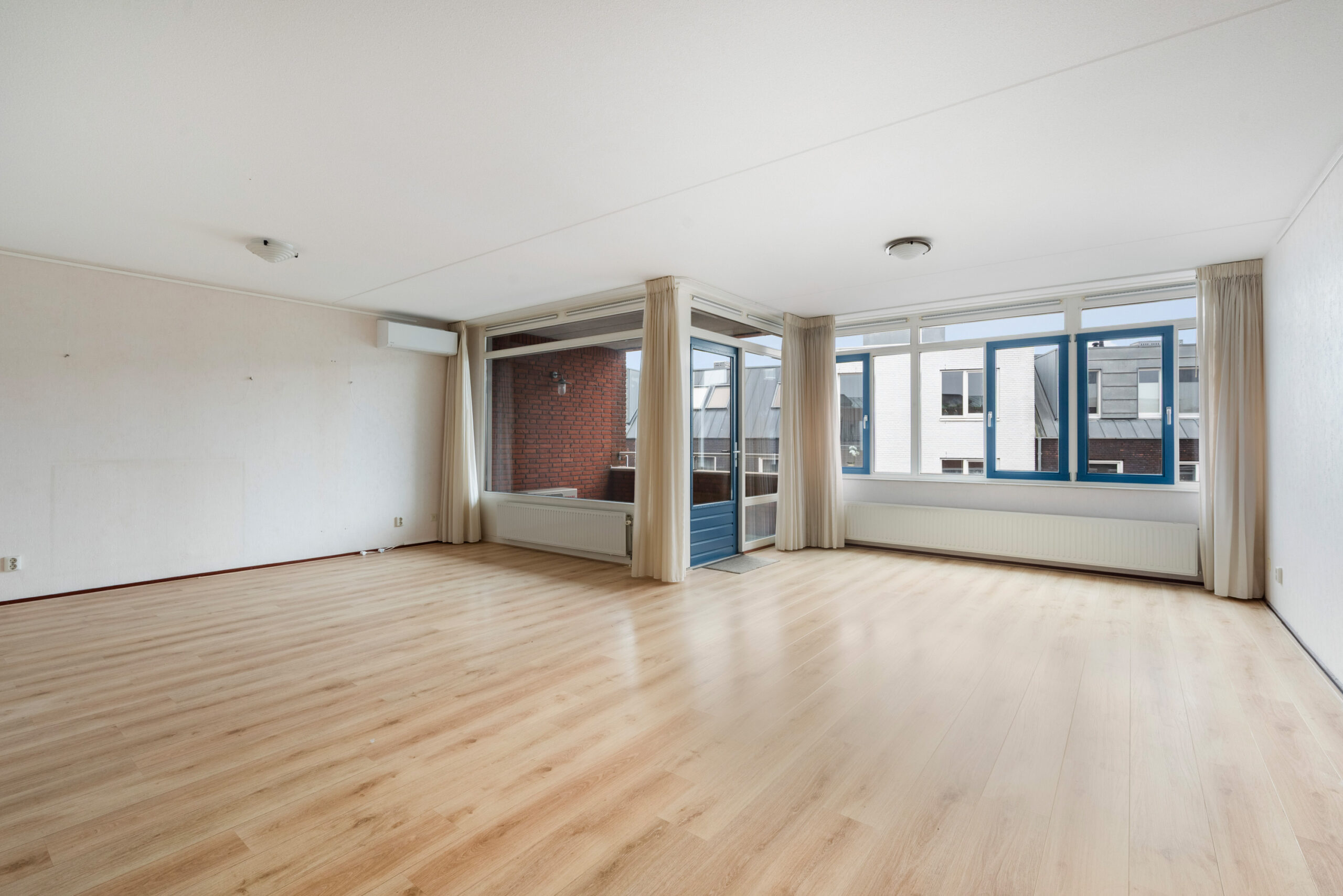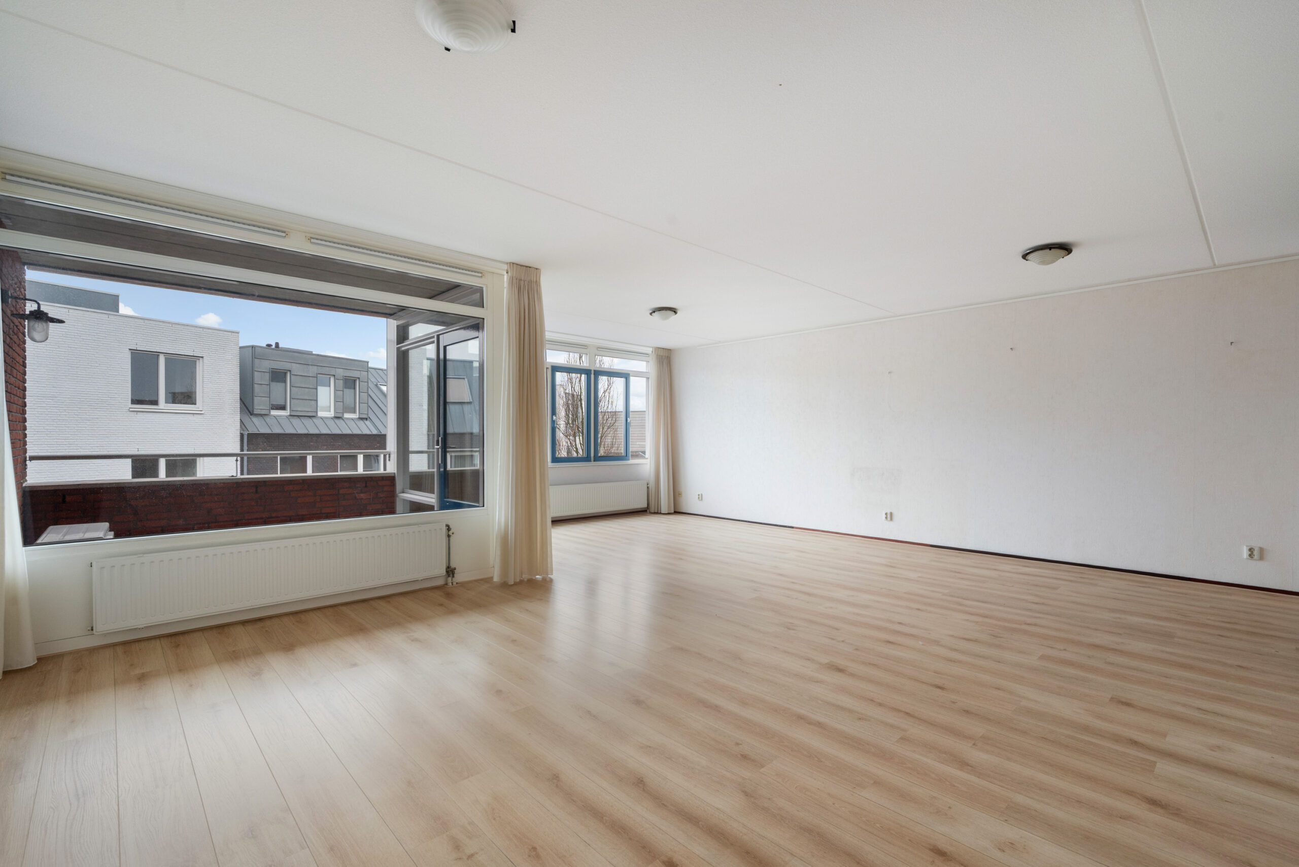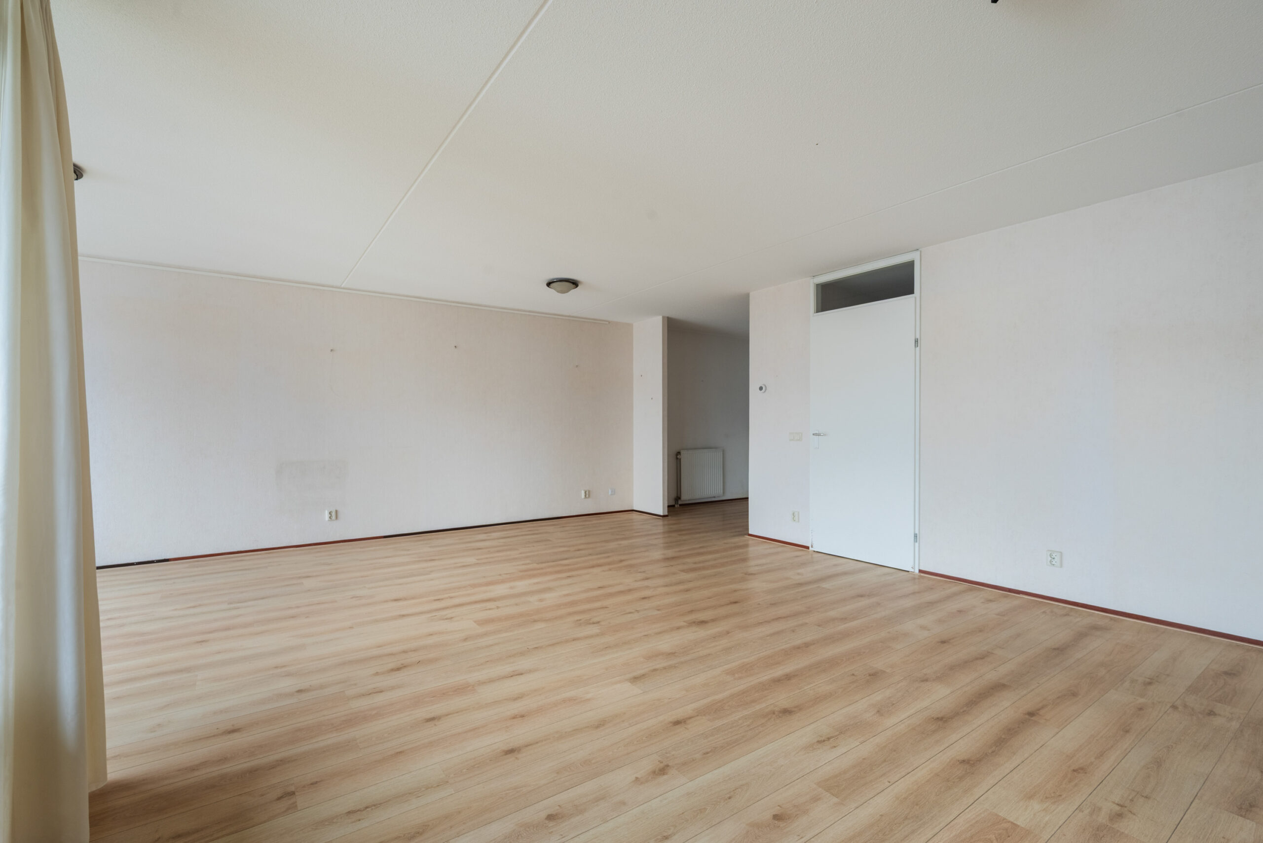De woonkamer (ca. 43 m2) heeft veel lichtinval en toegang tot het balkon op het Zuiden.