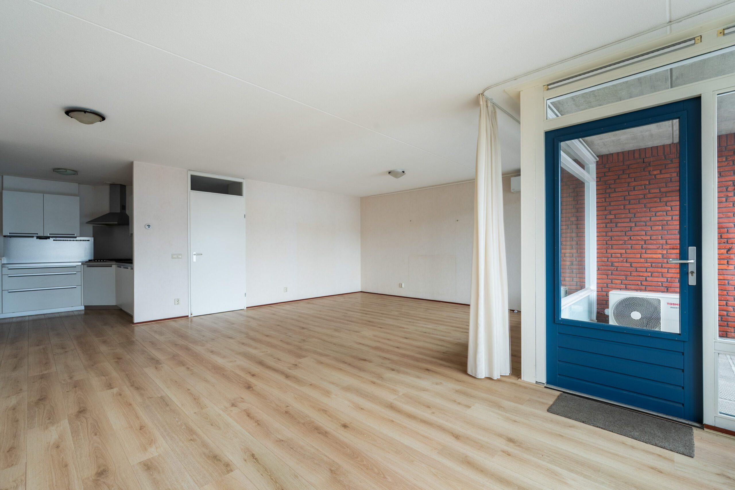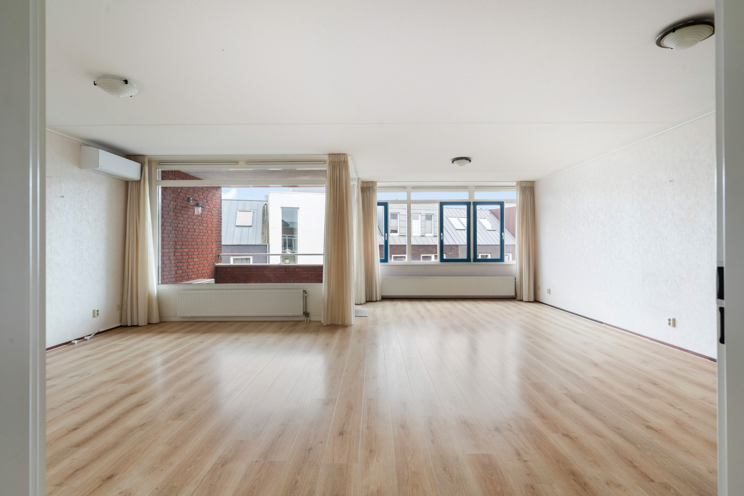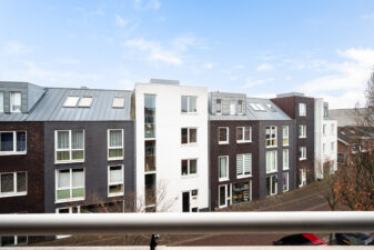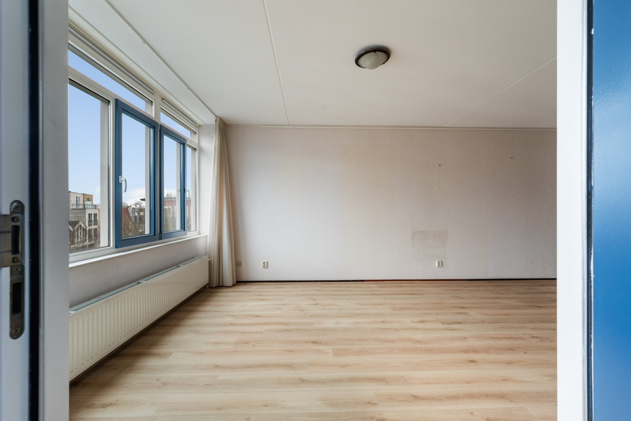 De woonkamer (ca. 43 m2) heeft veel lichtinval en toegang tot het balkon op het Zuiden.