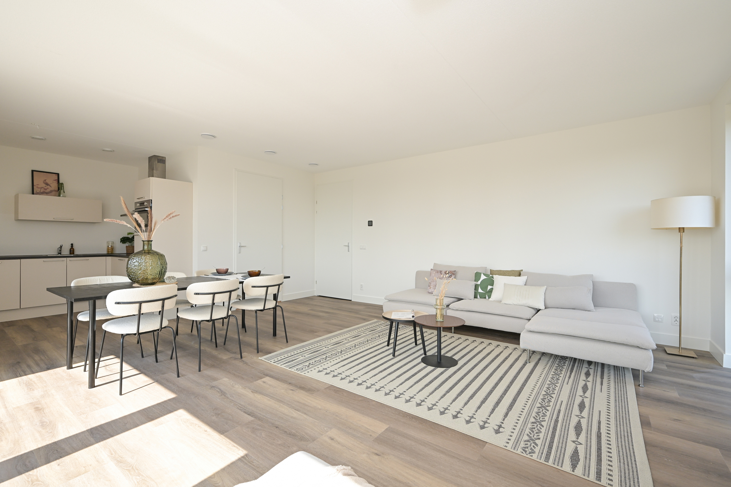 De woonkamer biedt toegang tot een zonnig balkon op het zuidwesten, waar je heerlijk buiten kunt zitten en genieten van de (middag)zon.